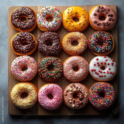 Colorful Donuts with Icing and Sprinkles on a Wooden Board