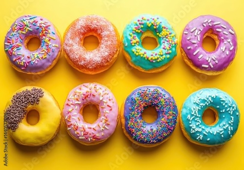 Colorful Donuts with Various Toppings and Sprinkles Arranged on a Bright Yellow Background Perfect for Sweet Treat Lovers and Dessert Enthusiasts