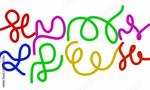 Colorful doodle swirls on white background. Playful looping lines in red, green, blue, pink, and yellow create a lively abstract art effect.