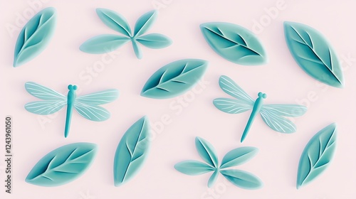 Colorful Dragonflies and Leaves on Light Background for Design Use