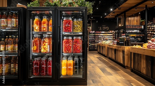 Colorful drinks displayed in modern refrigerated shelves of a grocery store.