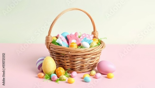 Colorful Easter Basket Filled with Treats and Decorative Eggs on Pink Surface