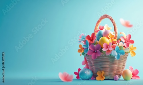 Colorful Easter Basket with Spring Flowers on Blue Background. AI generated illustration.