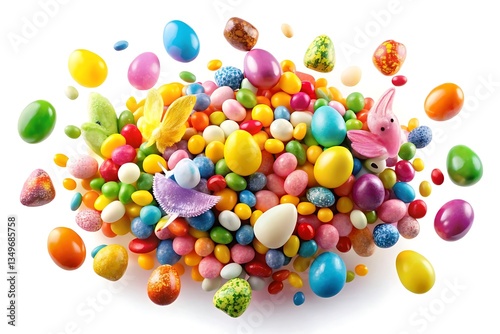 Colorful Easter eggs and candies on a white background with various vibrant colors like yellow, blue, green, pink, and orange