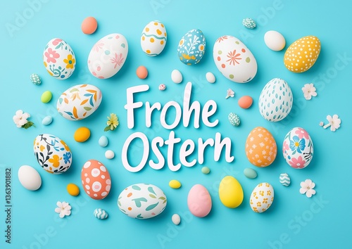 Colorful Easter Eggs Arranged with Frohe Ostern Greeting on Blue Background German Frohe Ostern