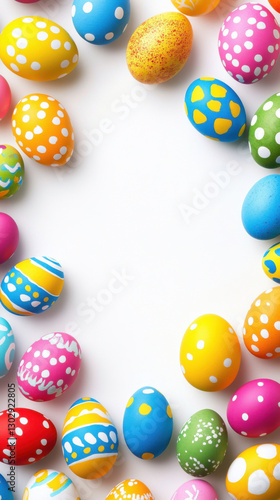 Colorful Easter eggs border a white background with copy space for text, top view.