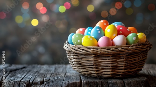 Colorful Easter Eggs in a Woven Basket Against a Bokeh Background