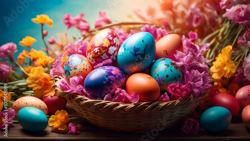 Colorful Easter Eggs in a Woven Basket Surrounded by Blooming Flowers During Springtime Celebration