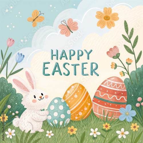 Colorful Easter Eggs in Green Grass with White Flowers – Festive Holiday Scene