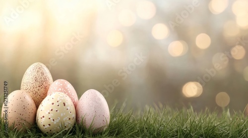 colorful Easter Eggs in Spring Grass,Soft Bokeh Background,Happy Easter,copy space, banner