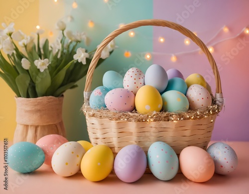 Colorful easter eggs in wicker basket with fairy lights and spring flowers
