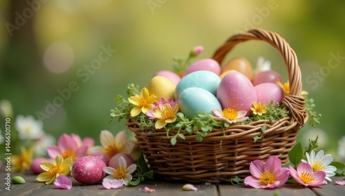 Colorful Easter eggs nestled in a spring basket overflowing with flowers , colorful eggs, eggs