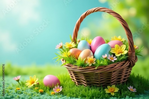 Colorful Easter eggs nestled in a spring basket overflowing with fresh flowers and green grass , flowers, spring holiday, Easter chicks