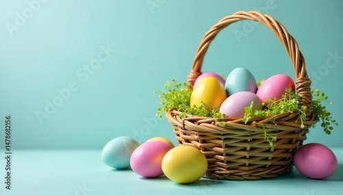 Colorful Easter eggs nestled in a woven Easter basket, springtime celebration , wicker, pastel, woven