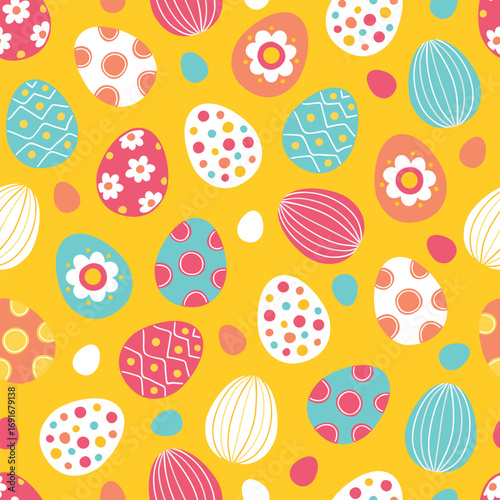 Colorful Easter eggs on a bright yellow background