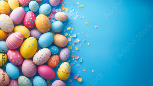 Colorful Easter eggs scattered on blue background