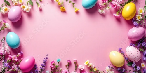 Colorful Easter eggs with flowers on empty background. Easter, spring, celebration concept. Festive decor for card, poster, banner with copy space.