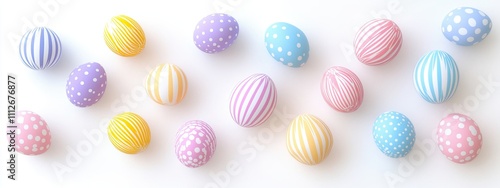 Colorful Easter eggs with striped and polka dot patterns isolated on a solid background. Banner, greeting card, wallpaper, background