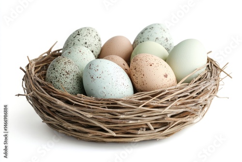 Colorful eggs nestled in a rustic bird's nest. Variety of speckled and solid-colored eggs