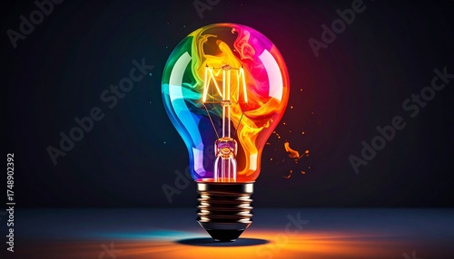 colorful electric glowing light bulb glowing with rainbow colors, orange, bold and vibrant, business concept