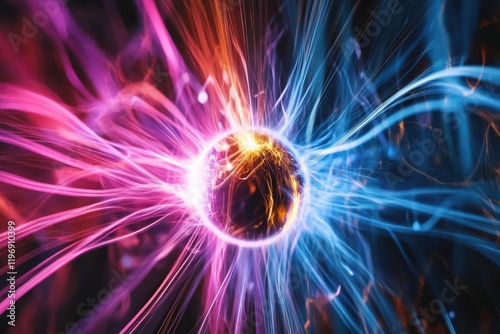 Colorful electric plasma sphere emitting vibrant energy and light in a dark background