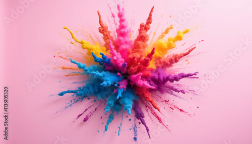 Colorful explosion of powder with vibrant shades on pink background, creating dynamic artistic effect