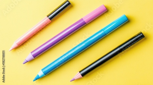 Colorful eyeliner pencils aligned perfectly on a sunny yellow background.