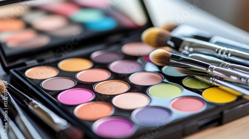 Colorful eyeshadow palette, makeup brushes, table, studio, beauty