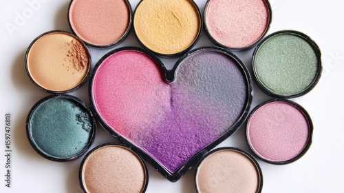 Colorful eyeshadow palettes arranged in a heart shape
