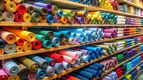 Colorful fabric rolls stacked on shelves in a textile store , textile shop