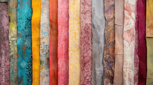 Colorful fabric strips displayed on a wall for decorative purposes or retail in a textile shop showcasing various textures and patterns