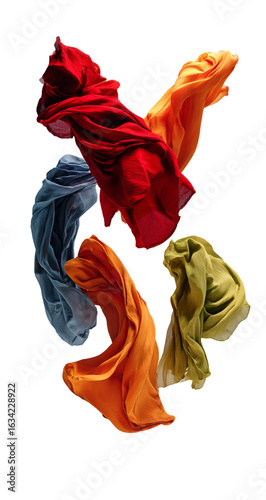 Colorful fabrics floating and dancing in the air, isolated on a transparent background