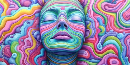 Colorful face portrait depicted in vibrant swirling rainbow patterns