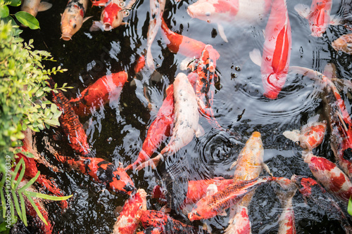 Colorful fancy carp fish or koi fish are swimming. Koi Fish swimming in the pond. Water is clear black and reflection of light. Top view with copy space.