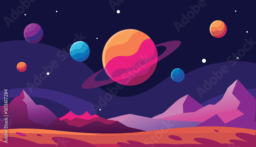 Colorful Fantasy Space Landscape with Planets and Mountains