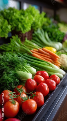 Colorful Farmers Market Produce Fresh Vegetables Display Tomatoes Carrots Lettuce Dill Celery Onions Healthy Eating Grocery Shopping