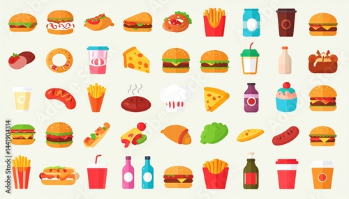 Colorful Fast Food Icons Collection Burgers Pizza Fries Drinks and More