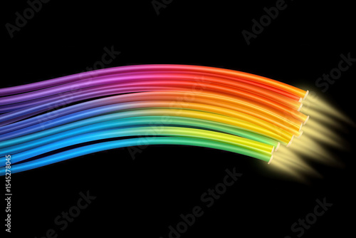 Colorful fiber optic cables in motion with glowing light effects, black background, technology concept