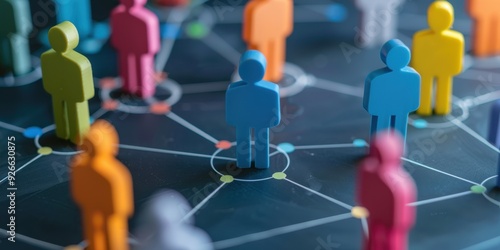 Colorful figurines representing people connected in a network, symbolizing community, collaboration, and social interaction.