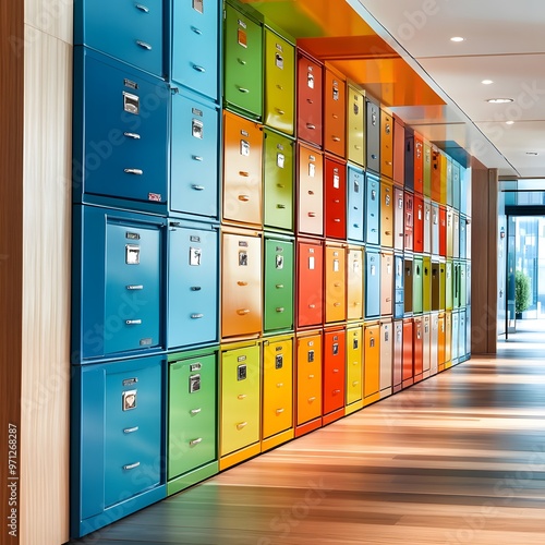 Colorful Filing Cabinets in a Modern Office Hallway.