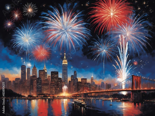 Colorful fireworks are released over a city skyline. Independence Day concept