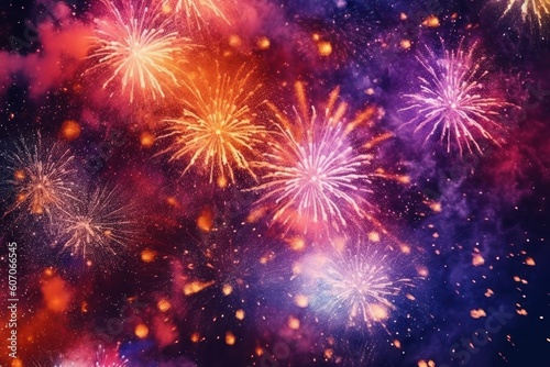 Colorful fireworks at New Year and copy space abstract holiday background elegant glitter confetti.
