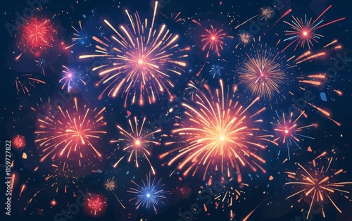 Colorful fireworks blooming in the sky on a simple and clean dark blue background.