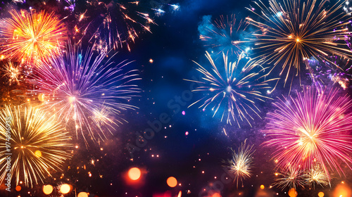 Colorful fireworks burst over a nighttime skyline during a festive celebration