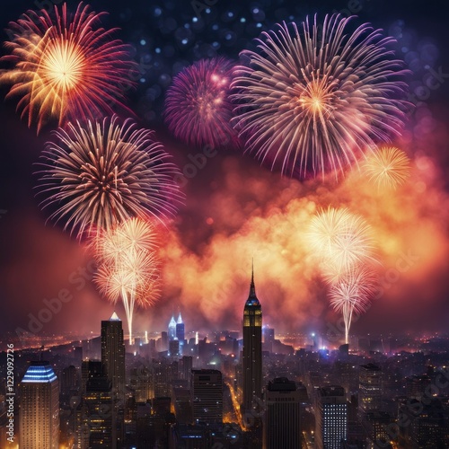 Colorful fireworks burst over a sprawling urban landscape, adding festive light to the night city, AI generated