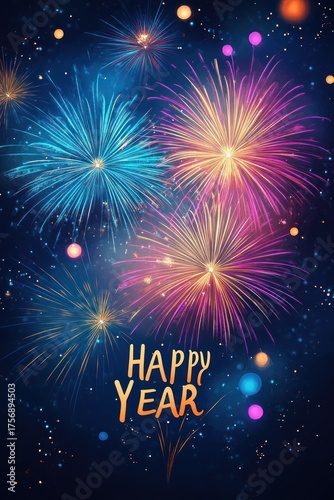 Colorful fireworks bursting in the night sky with festive glowing orbs and vibrant sparks creating a celebratory and joyful atmosphere