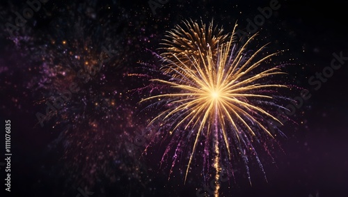 Colorful fireworks explode against a dark night sky. A large, golden firework is central.
