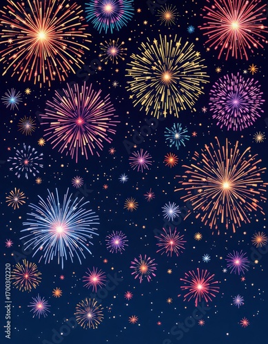 Colorful fireworks exploding in night sky with glowing sparks and stars