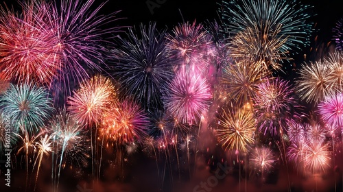 Colorful fireworks. Festive christmas pyrotechnics firecrackers. Xmas winter party festival salutes background, no logos, no brands