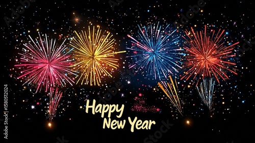 Colorful Fireworks Happy New Year Background for Festive Greeting Cards, Banners, Invitations, Celebration Decoration